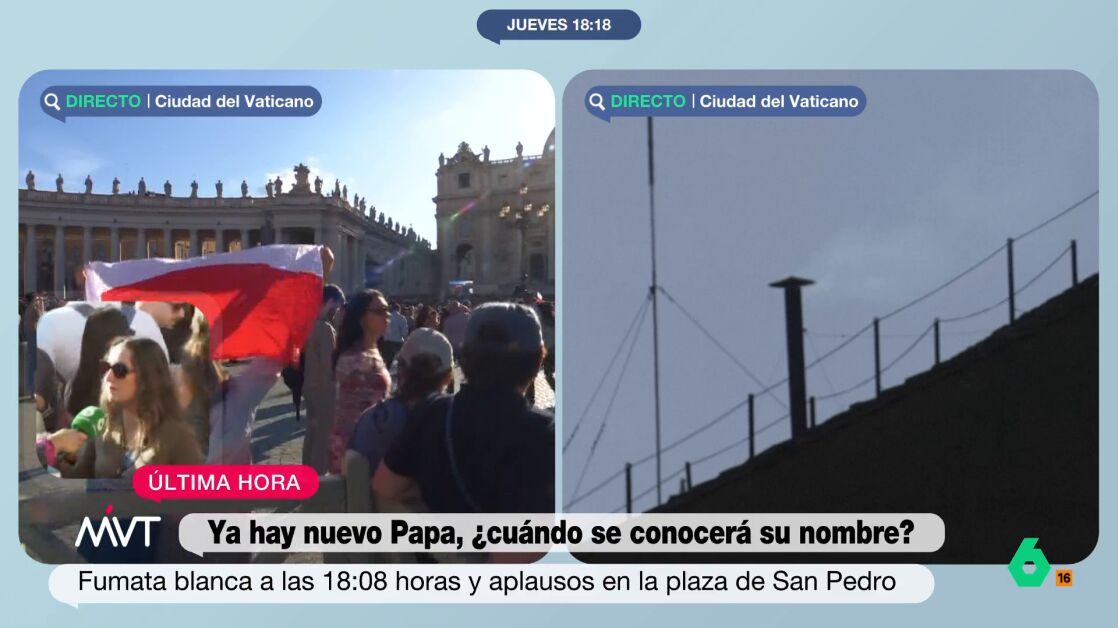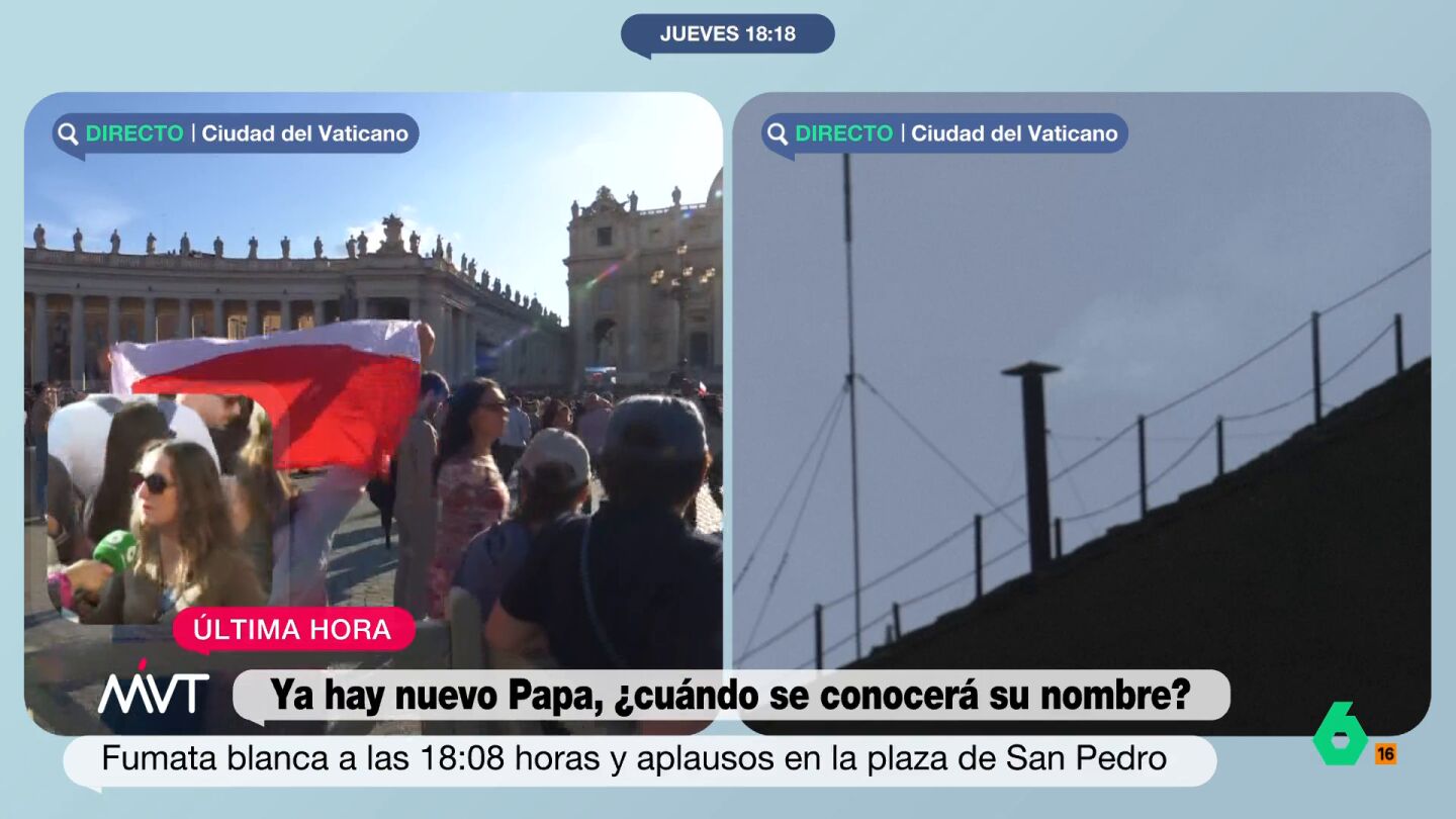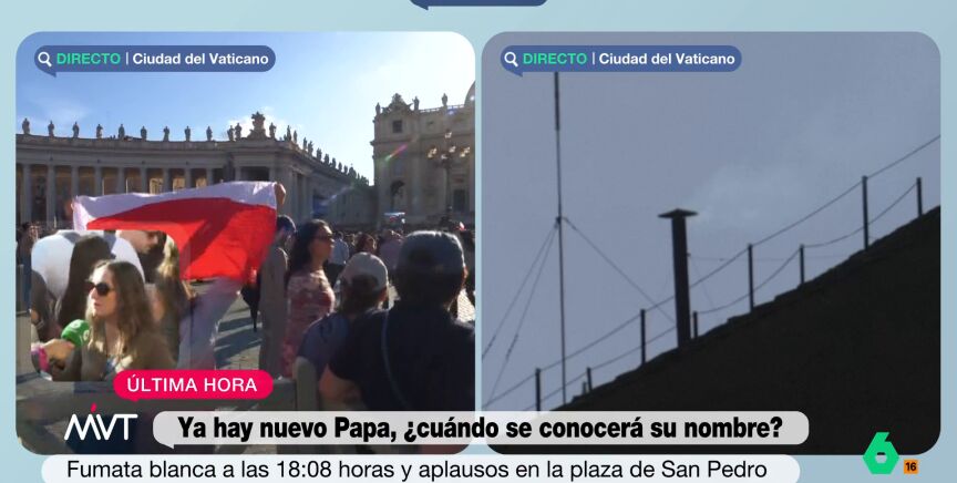 "Estás ahora mismo en plena fiesta en la plaza de San Pedro, vemos banderas, gente saltando... parece la final del Mundial", le dice Iñaki López a la periodista. "Casi, casi, te diré", responde Cristina, entre risas, "mucha gente lo ha vivido así". La periodista explica que se han dado cuenta de que había comenzado a salir esa fumata blanca por el murmullo de la gente ya que ellos estaban de espaldas esperando a comenzar el directo.