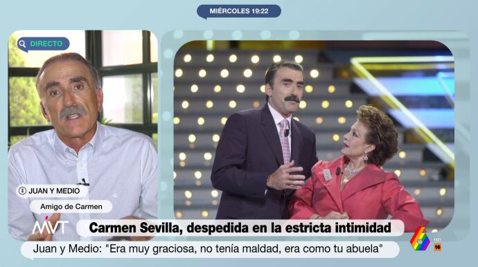 Juan y Medio, amigo y compañero de trabajo de Carmen Sevilla, recuerda en Más Vale Tarde a la actriz y presentadora que fallecía ayer a la edad de 92 años. Tras sus muchas colaboraciones juntos, el cómico afirma que "he tenido con ella un trato familiar" y explica que "trabajar con ella era algo distinto, no sabías nunca lo que iba a suceder, pero era bueno".