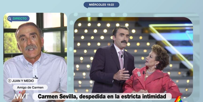 Juan y Medio, amigo y compañero durante muchos años de Carmen Sevilla, recuerda cómo era su relación dentro y fuera de los platós de televisión y comparte anécdotas divertidas. "Para mi es un día muy triste", afirma emocionado en este vídeo.