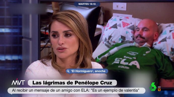"Que él termine el mensaje diciendo 'viva la vida'. Es un ejemplo de valentía como pocos he visto", comentaba la ganadora del Oscar en el vídeo sobre estas líneas visiblemente emocionada. María Lamela explica que Penélope también aprovechó su visita a 'El Hormiguero' para pedir ayuda en la recaudación de fondos para la investigación de la ELA, mientras Iñaki destaca el papel de Sabaté en la visibilización de la enfermedad: "Tiene mucho sentido del humor y es muy activo en las redes".
