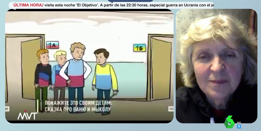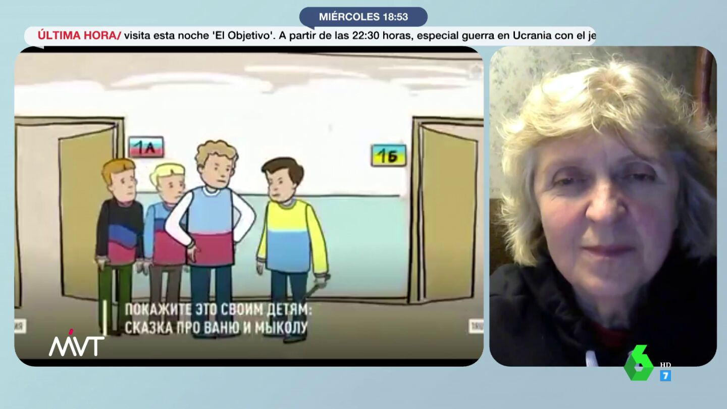 Elena Bogush no se sorprende ante los dibujos animados propagandísticos que se estarían distribuyendo en colegios rusos sobre la guerra en Ucrania, en los que un niño ucraniano pega con un palo a uno ruso. "No me sorprende mucho", afirma la historiadora y socióloga rusa, que aunque no cree que sea algo común, sostiene que esto no le asombra.