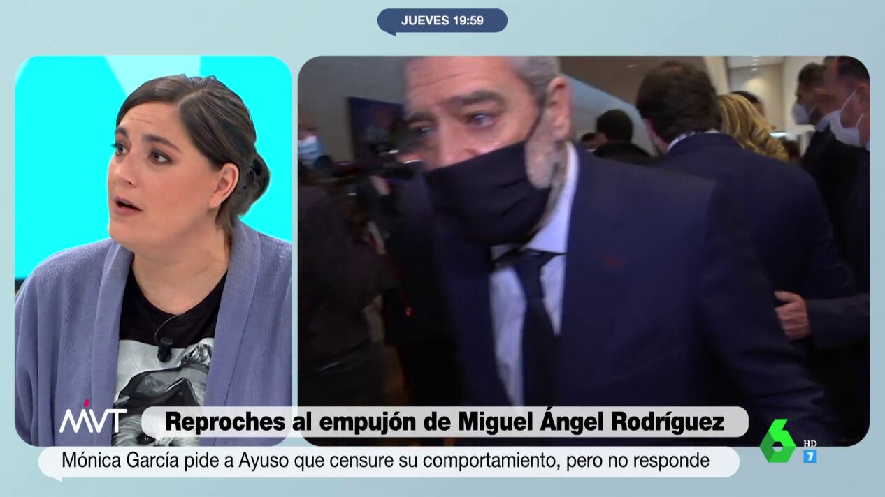 El empujón de Miguel Ángel Rodríguez a Andrea Roperocuando grababa un reportaje para El Intermedio ha provocado que la oposición en la Asamblea de Madrid recriminara a Ayuso que no hubiera reprobado el comportamiento de su jefe de gabinete. "El matonismo con la prensa es incompatible con la libertad", ha aseverado Mónica García.