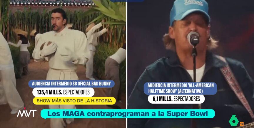 Ahora bien, parece que él lo vio, como hicieron otras 135,4 millones de personas, lo que ha convertido el 'show' de Bad Bunny en la Super Bowl en la actuación más vista de la historia. Muy lejos se queda, con 6,1 millones de espectadores, 'El intermedio puramente americano', el evento alternativo que propusieron los MAGA.