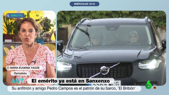 La periodista María Eugenia Yagüe ha estado este miércoles en Más Vale Tarde para comentar la nueva visita del rey emérito Juan Carlos I a España. El monarca ha aterrizado este miércoles en Galicia, discretamente, para asistir a una semana de regatas y, tal como confirma Yagüe, no pasará por la Zarzuela y tampoco tiene previsto ver a la reina emérita Sofía.