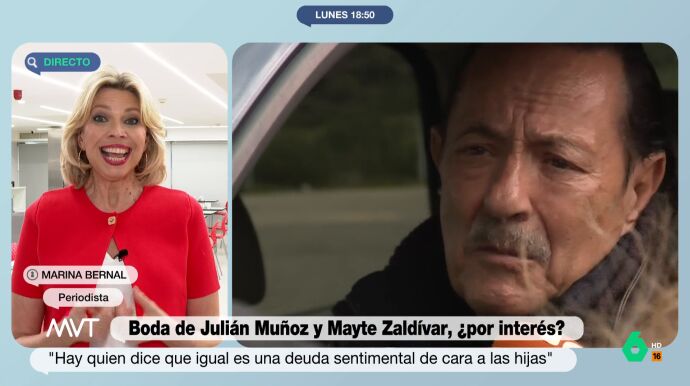 Bernal detalla que detrás de este matrimonio puede haber "una deuda sentimental" con las hijas de la pareja, viendo "extraño" que ambos no quieran confirmar de forma pública el enlace. "-Julián Muñoz- Tiene un cáncer bastante complicado. Quiere vivir en tranquilidad absoluta y Mayte está haciéndose cargo de Julián. Él no deja de pedir perdón diariamente por lo que la hizo en el pasado", explica.