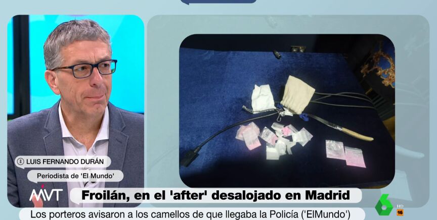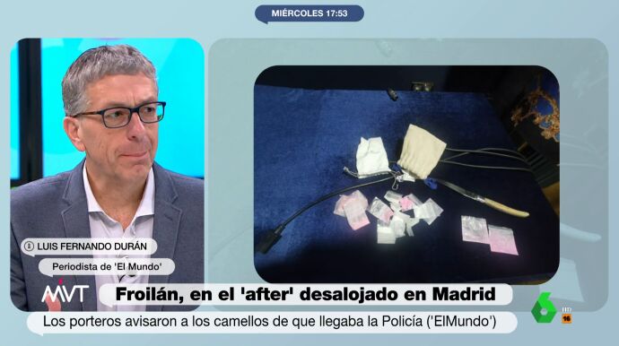 El periodista de El Mundo Luis Fernando Durán ha ofrecido en Más Vale Tarde más detalles sobre el 'putiafter' que desalojaron este fin de semana y donde se encontraba Felipe Juan Froilán. En concreto, uno de los porteros del local, que contaba con seis miembros del equipo de seguridad debido a la 'exclusividad' del espacio, se encargó de avisar a los camellos que había en el interior cuando vio llegar a la Policía.