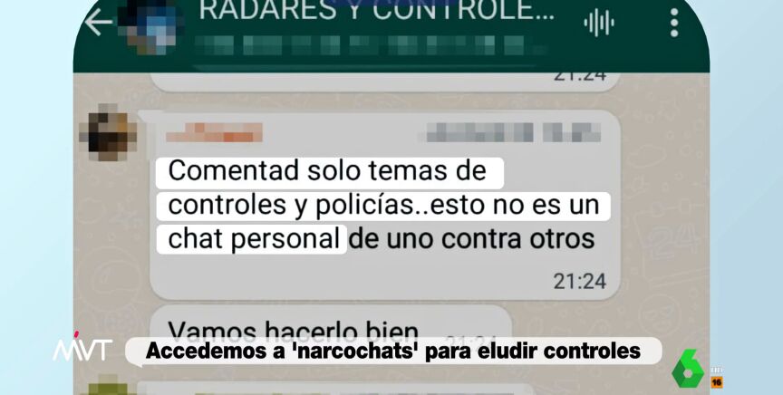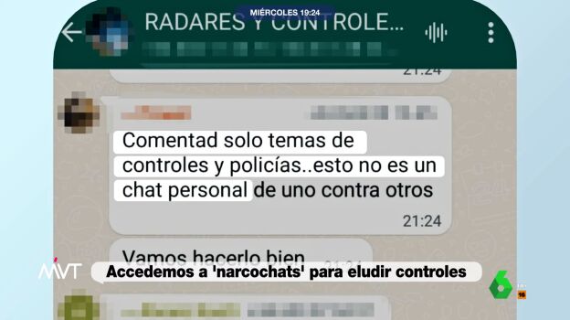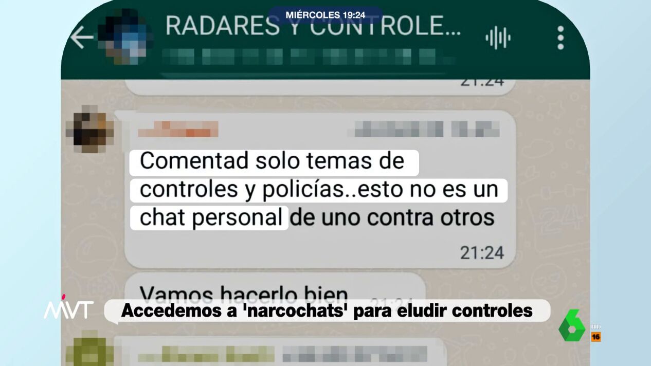 Más Vale Tarde ha accedido a algunos 'narcochats' en los que narcotraficantes se advierten de controles policiales establecidos con el objetivo de no ser multados, pero sobre todo con el fin de que la mercancía esté siempre a salvo. Estos grupos, en ocasiones multitudinarios, se crean en aplicaciones de mensajería instantánea como Whatsapp o Telegram.