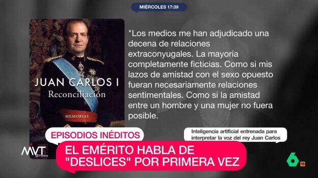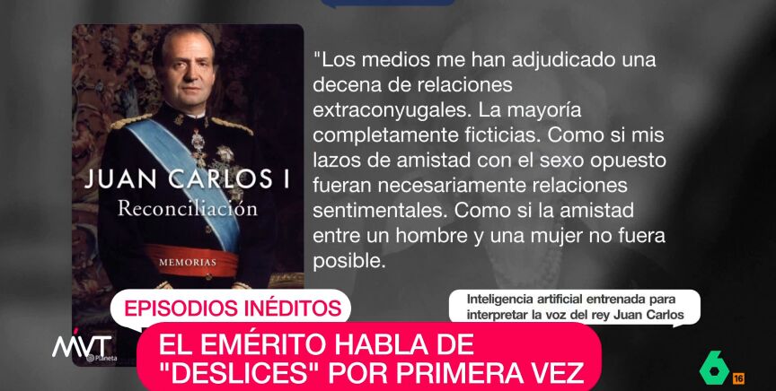 Sanabria expone que el que tampoco aparece en el libro el nombre de Corinna Larsen aunque sí que señala que una de esas relaciones se hizo pública y le provocó "numerosos problemas en el reinado". El programa ha recurrido a la Inteligencia Artificial para que sea el 'propio' emérito el que lea algún fragmento de sus memorias. "No es Latre, pero da el pego, nos ha quedado muy apañado", comenta Iñaki López.