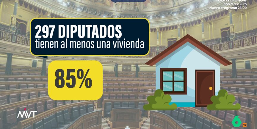 Pero si miramos dentro del Congreso, descubrimos que la mayoría de los diputados son propietarios. En teoría, deben ser un reflejo de la sociedad española, pero de los 350 diputados que conforman el hemiciclo, 297 tienen una vivienda o más de una. Esto supone el 85% del total de la Cámara Baja; mientras que entre los ciudadanos el porcentaje es del 74%, diez puntos menos.