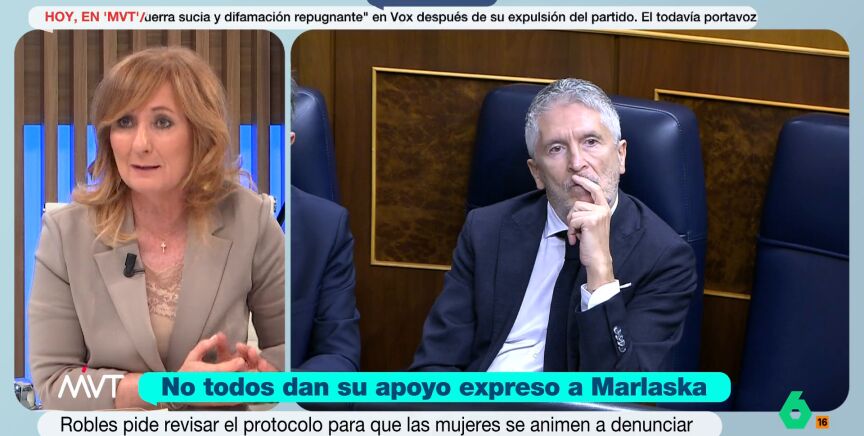 Mayte Alcaraz expone que Robles "no es la ministra que mejor se lleva con Marlaska". "Me consta que no le ha gustado que Marlaska haya depositado la carga en la víctima", indica la periodista. Alcaraz indica que lo que ha hecho el ministro de interior "kafkiano".