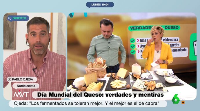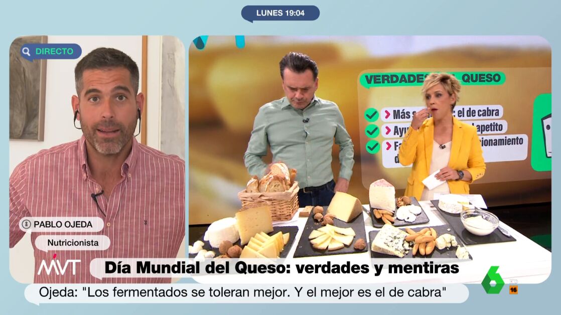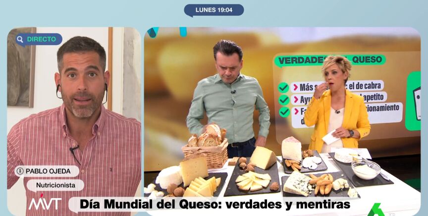Iñaki López y Cristina Pardo aprovechan las explicaciones de Pablo Ojeda para comer queso y hacerlo sin remordimiento. Este alimento ayuda a controlar el apetito y favorece el buen funcionamiento del organismo, según explica el nutricionista, que enumera los beneficios de los tipos de queso.
