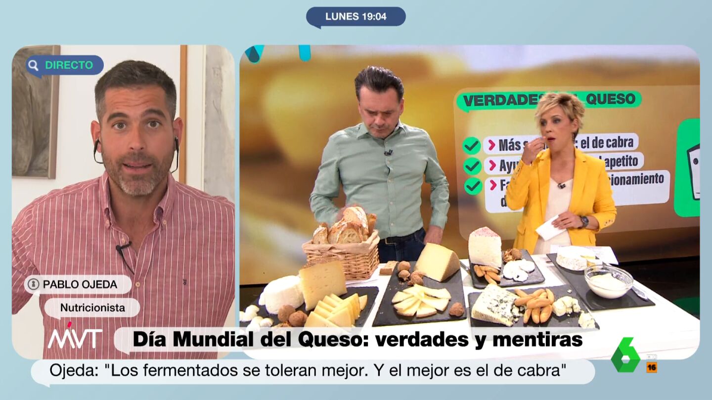 "Dentro de los quesosque hay, el de cabraa mí me encanta", asegura Pablo Ojeda en su conexión en directo con Más Vale Tarde mientras Cristina Pardo e Iñaki López dan más de un bocado en plató a los diferentes tipos de queso que sobre la mesa les esperan. El queso de cabra se trata de una de las variedades más saludables, explica el nutricionista. "Tiene muy poquitas calorías y menos porcentaje de grasa. Además, es rico en, palabra mágica, probióticos, que nos ayudan con nuestra flora intestinal. Por lo tanto, es un aliado para la vida", asegura.