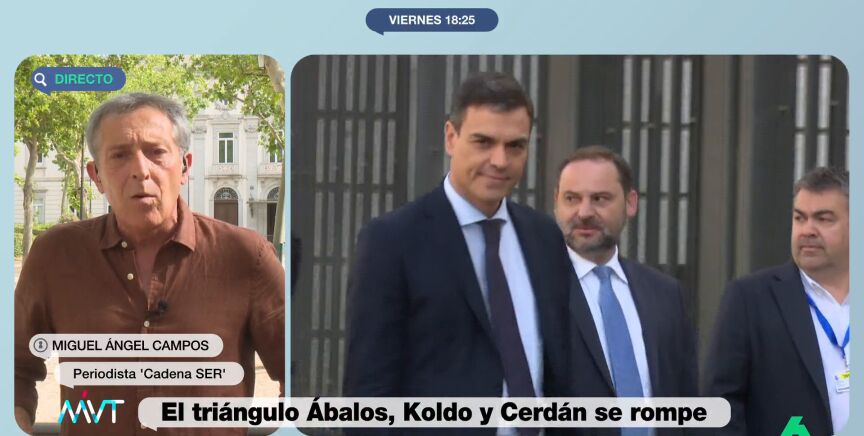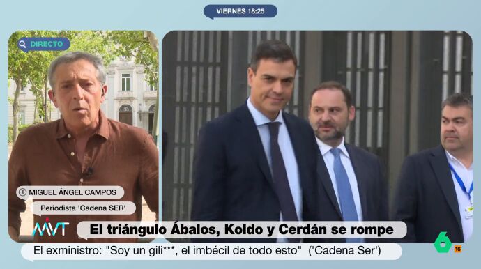 "Es una bomba de relojería", opina Miguel Ángel Campos, periodista de Cadena Ser, ya que en la entrevista que ha concedido este jueves ha reconocido que hay cosas que se han hecho mal y que está enfadadísimo con [[LINK:INTERNO|||Article|||6855a222aa67b0e43a756557|||Pedro Sánchez por "dejarle caer" y defender –hasta el final- a Cerdán]].
