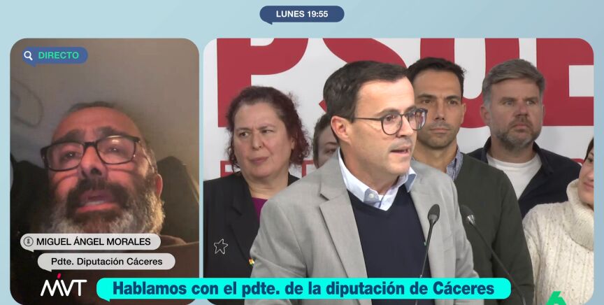 Miguel Ángel Morales, presidente de la Diputación de Cáceres, valora en Más Vale Tarde la dimisión de Miguel Ángel Gallardo como líder del PSOE extremeño. Morales la califica de "lógica" tras los malos resultados electorales.
