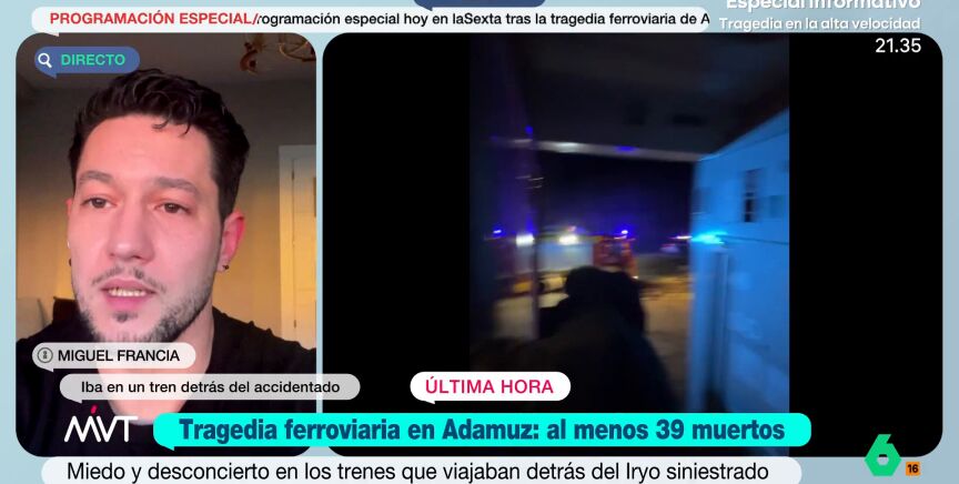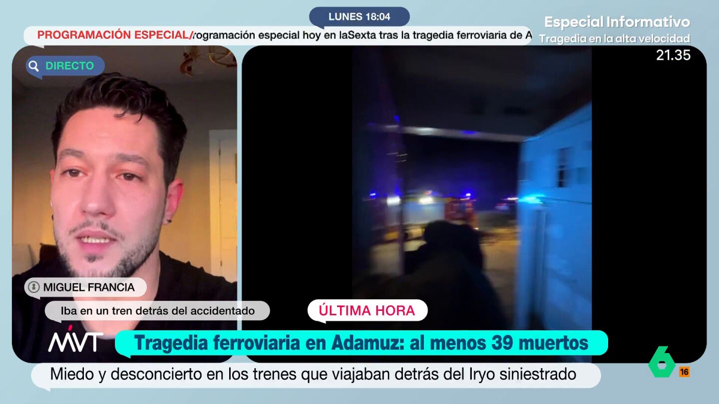 Este domingo se producía en Adamuz, Córdoba, un grave accidente ferroviario después de que un tren Iryo haya descarrilado. Miguel Francia viajaba en un tren que iba detrás del accidentado. Como explica, su tren se detuvo de repente y se apagaron todas las luces. "Se quedaron encendidas las de emergencia", señala, y, en ese momento, los trabajadores del tren les informaron que había pasado algo.