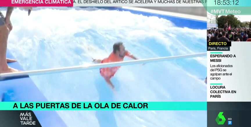 Madrid, como el resto de comunidades de España, sufre una ola de calor extremo: seis días en los que se registrarán temperaturas por encima de los 37 grados, y el sábado, más de 40. Estas alarmantes cifras han llevado a muchas personas a buscar actividades de ocio a la sombra o refrescantes. Es lo que nos ha querido mostrar nuestro compañero Pablo Hermaz, que se ha lanzado a probar surf con un resultado de lo más divertido.