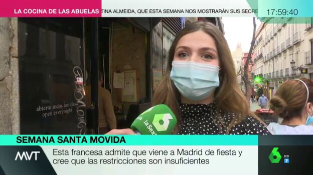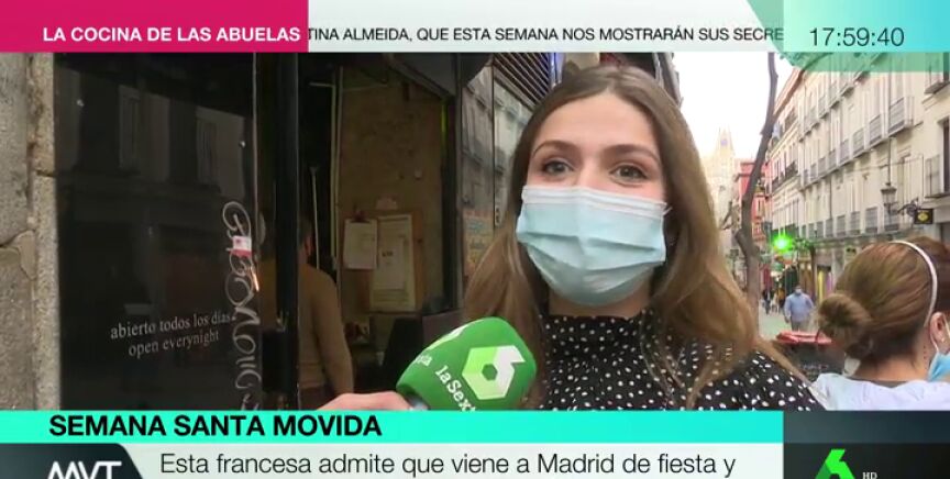 La joven reconoce ante las cámaras de laSexta que si Madrid no toma medidas drásticas los franceses, como ella, comenzarán a llegar en masa. Sin embargo, no rehúsa reconocer que ella misma sale de fiesta en la capital.