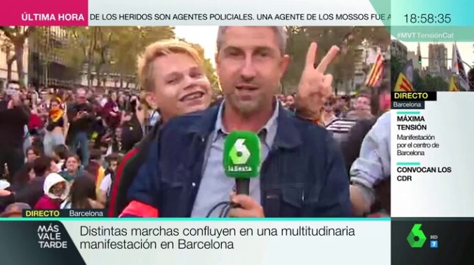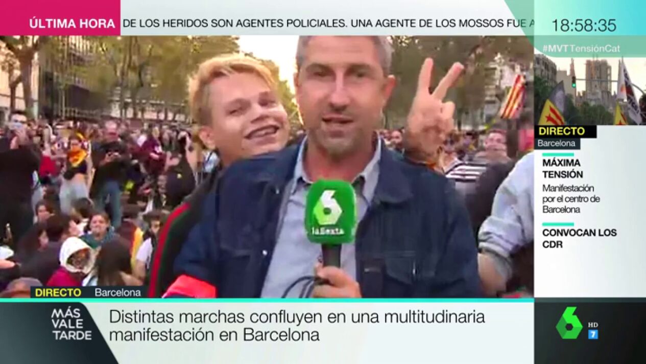 Un manifestante de la sentada pacífica convocada por los CDR en la Gran Vía de Barcelona ha intentado boicotear el directo de un reportero de laSexta en Más Vale Tarde y Mamen Mendizábal ha criticado los hechos.