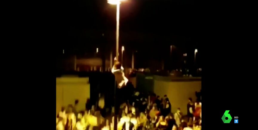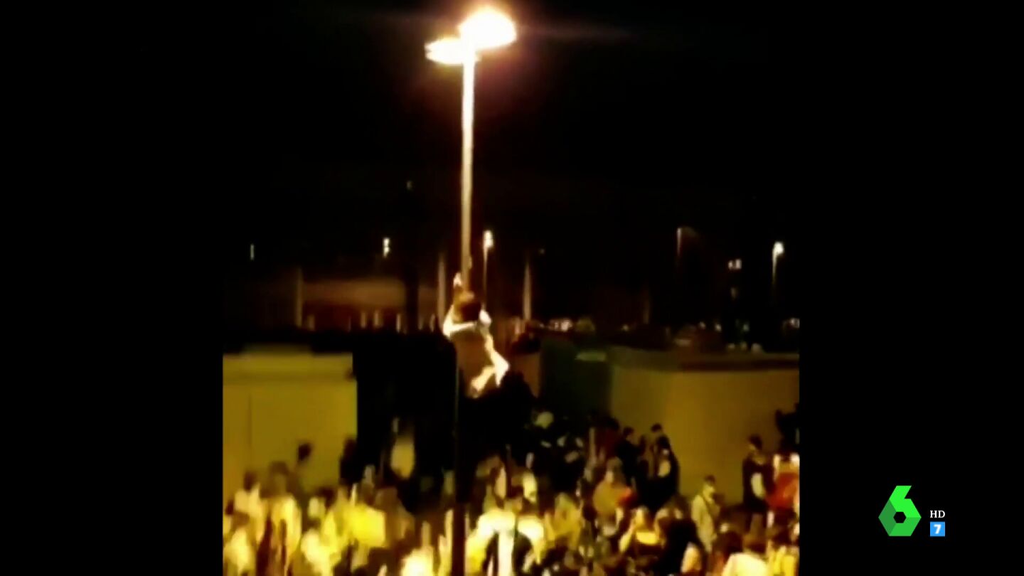 El momento en el que un joven se rompe la pierna tras caer de una farola en un botellón