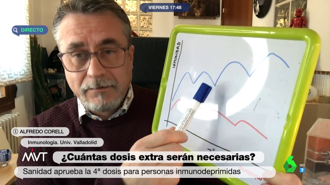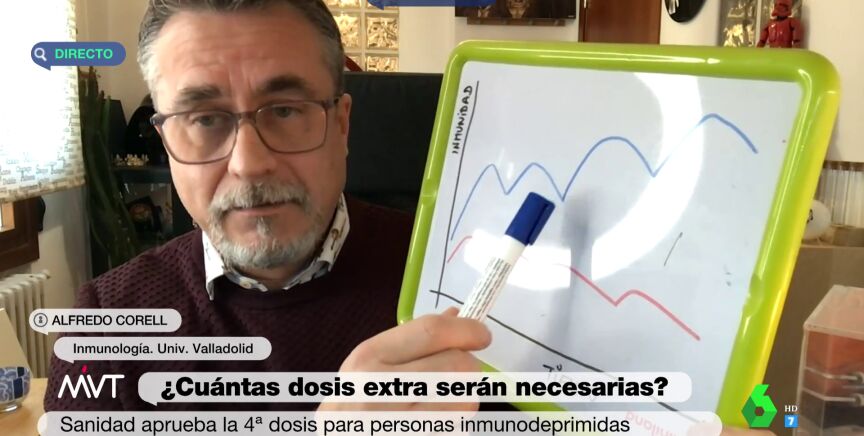 Para el inmunólogo, tampoco es necesaria esa dosis de refuerzo para mayores de 40 años, pero sí para mayores de 65 años por el "envejecimiento" del sistema inmunitario. En el vídeo, Corell saca su pizarra para explicar cómo se producen los anticuerpos y los linfocitos T en nuestro organismo.