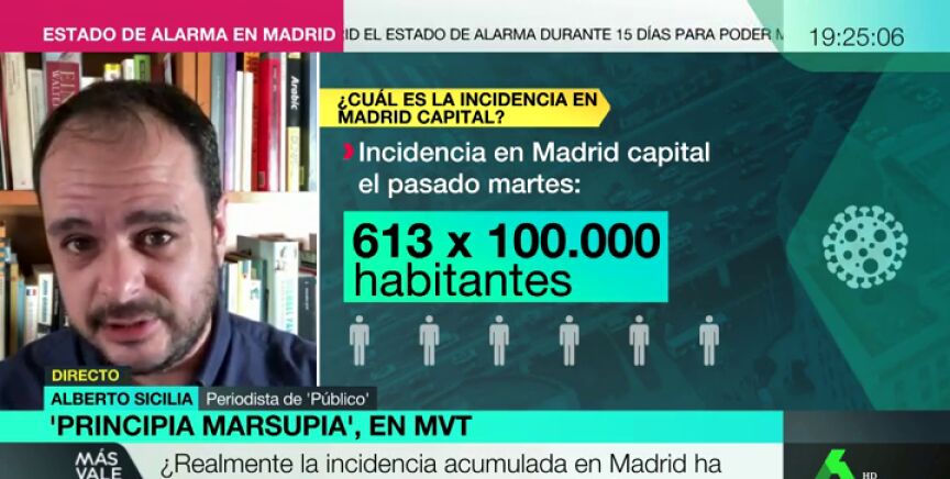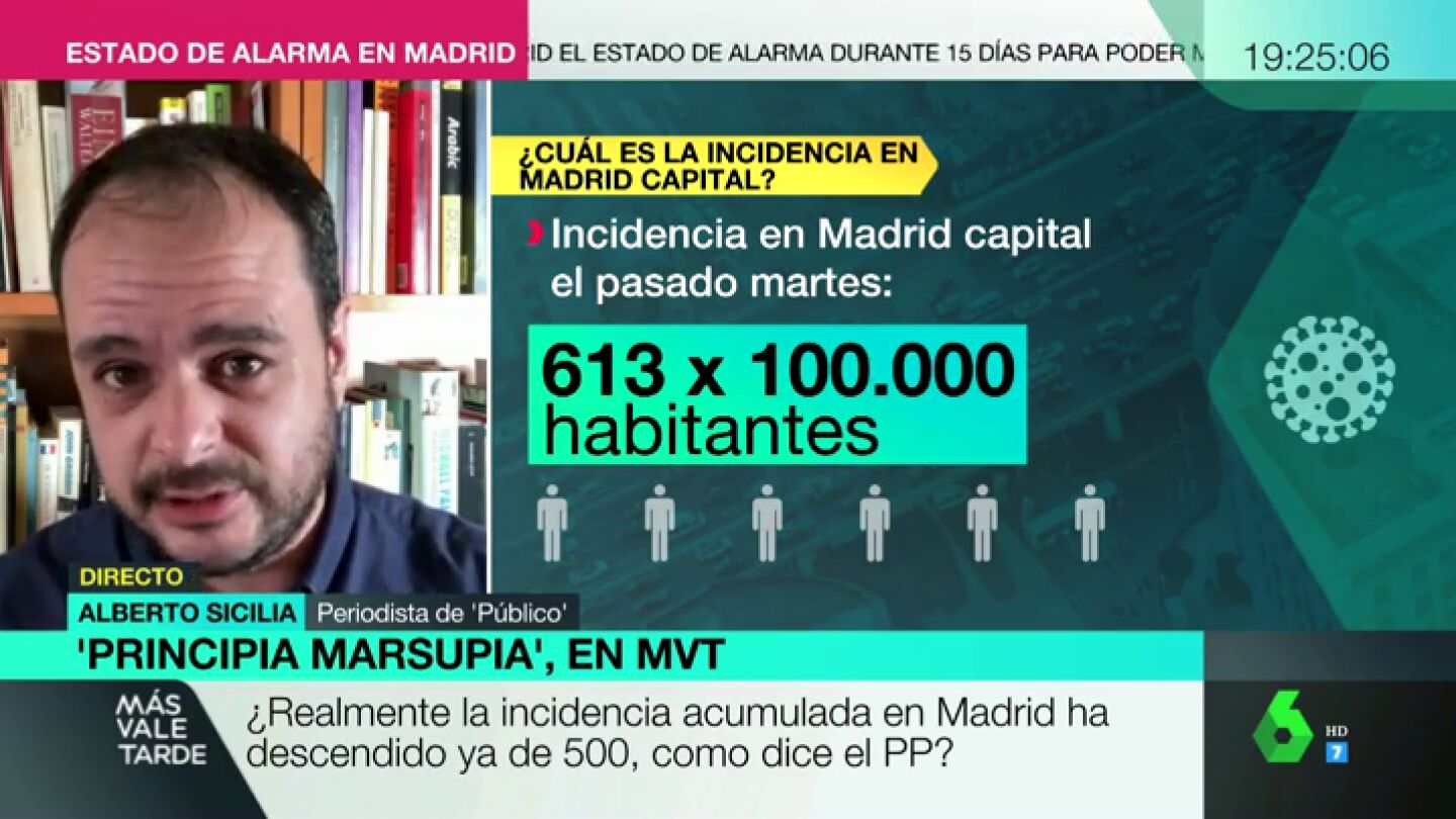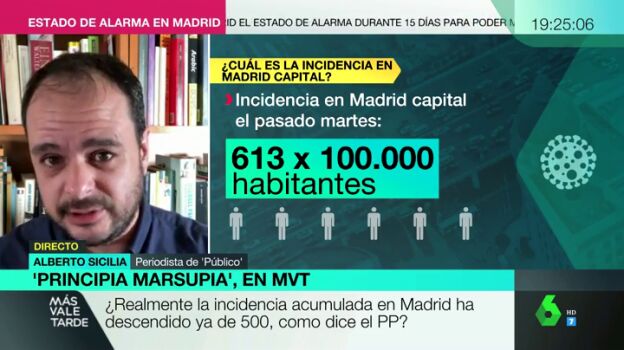 Alberto Sicilia, periodista de 'Público', desmiente las palabras de Almeida con ayuda de los datos. "La Comunidad de Madrid está en 540 casos por cada 100.000 habitantes, según los últimos datos del Ministerio. Además, en los últimos datos que da la propia Comunidad de Madrid, Madrid ciudad estaba en 613 casos", explica Sicilia.