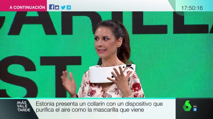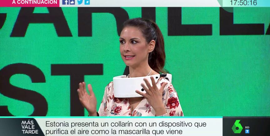 Beatriz Correal, periodista de laSexta, ha probado en directo este invento que pretende 'devolver la sonrisa al mundo'. Funciona cogiendo el aire de nuestro alrededor, pasando por una luz ultravioleta y siendo devuelto a 30 litros por minuto sobre nosotros.