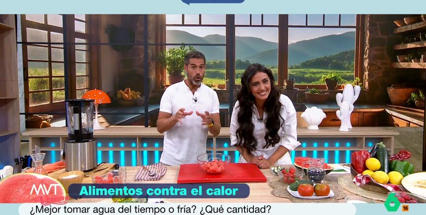 María Lamela confiesa al nutricionista que ella no suele beber mucha agua. "Si lo sustituyo por refrescos o infusiones frías, ¿me hidrato igual?", plantea. "No", aclara Ojeda, "los refrescos no son lo más aconsejable porque tienen un alto contenido de azúcar".