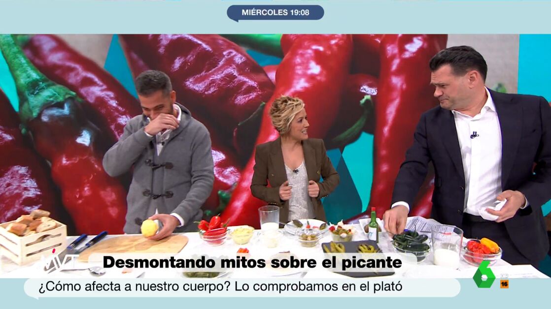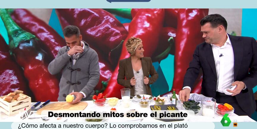 Los presentadores dejan reacciones totalmente contrarias al tomar picante, con Iñaki López llegando a las lágrimas. Para que el picor pase mejor, lo mejor es beber un vaso de leche entera.