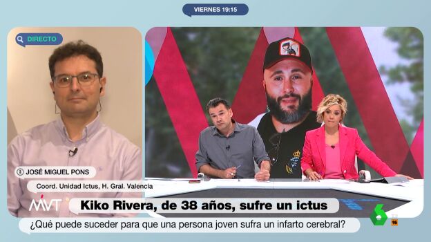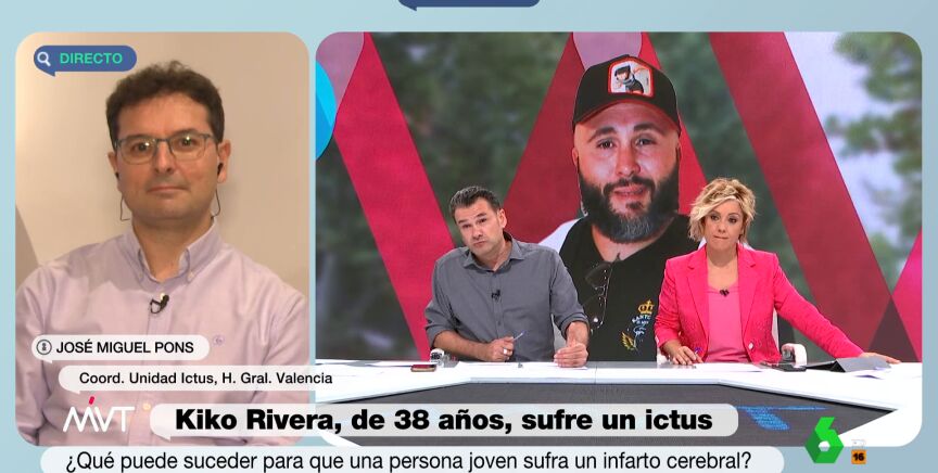 ¿Qué puede suceder para que una persona joven sufra un infarto cerebral? Es la pregunta que desde Más Vale Tarde hemos lanzado a José Miguel Pons, coordinador de la Unidad de Ictus del Hospital General de Valencia, a raíz de este accidente cerebrovascular que ha sufrido Kiko Rivera, teniendo que ser ingresado este viernes, con 38 años: "Es una enfermedad que es más habitual en personas de más de 65 años, pero cada vez vemos una mayor tasa de incidencia en menores de 45 años, con 10 a 15 casos por cada 100.000 habitantes".