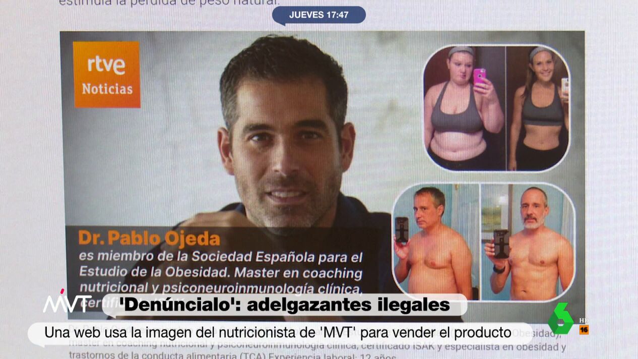 En el vídeo sobre estas líneas, Ojeda asegura que esas gotas, que prometen adelgazar cinco kilos en una semana, "no sirven para nada". Además, se pone en contacto con los responsables, que incluso le niegan estar usando sus datos y sus fotos: "¿Que me lo estoy inventando? Vamos a ver, si tengo la web delante", le responde el nutricionista, que les recuerda que "están vendiendo un producto ilegal".