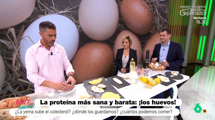 Y a la pregunta de Cristina Pardo de por qué en los supermercado no están en la nevera, Pablo Ojeda explicó que esto es así "porque salen de la gallina muy calientes, en los estantes de los supermercados se atemperan, y luego se enfrían en la nevera". "Es el proceso térmico", indicó, tras lo que aclaró que "no hay diferencias entre los huevos blancos y marrones", sino que ambos "tienen los mismos nutrientes, muchísima proteína y calcio".