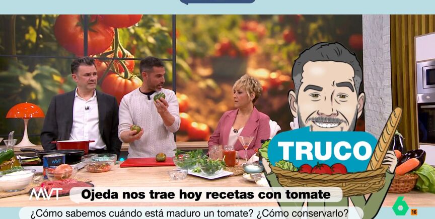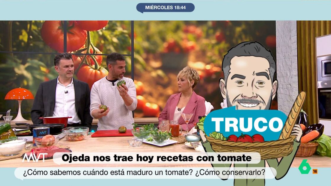 Pablo Ojeda visita Más Vale Tarde para hablar sobre los tomates. El nutricionista ha compartido varios trucos entorno a este fruto. Ojeda explica cómo podemos saber que un tomate está maduro. "Sobre todo es por su color y al tocarlo", indica. "Los tomates, al igual que muchas frutas, van madurando un poco más por la parte de abajo", añade, "si está muy duro, fuera".