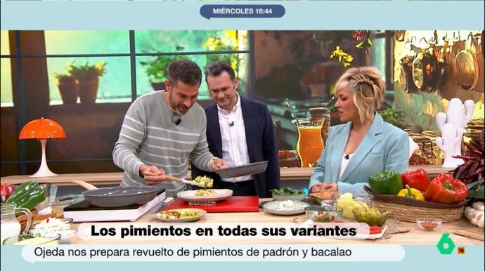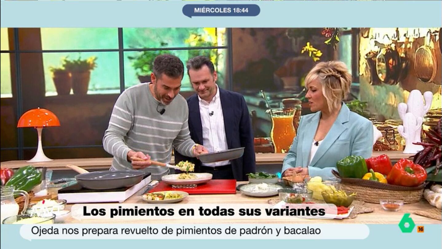 Pablo Ojeda sorprende a Iñaki López y Cristina Pardo con una receta rápida y saludable: un revuelto de pimientos con bacalao