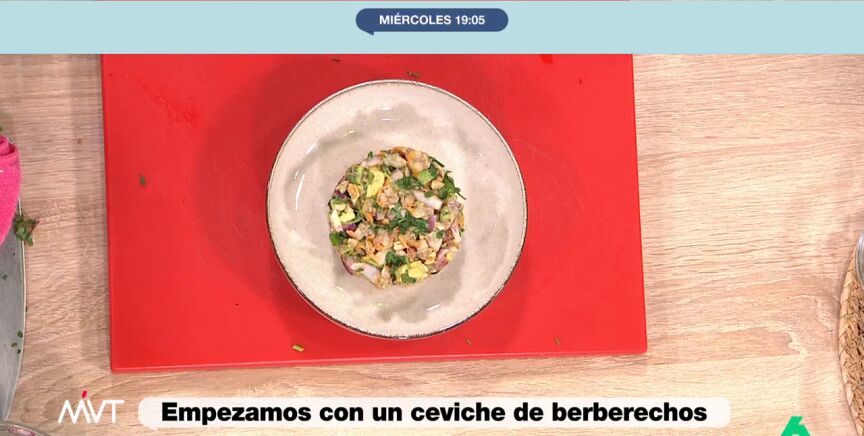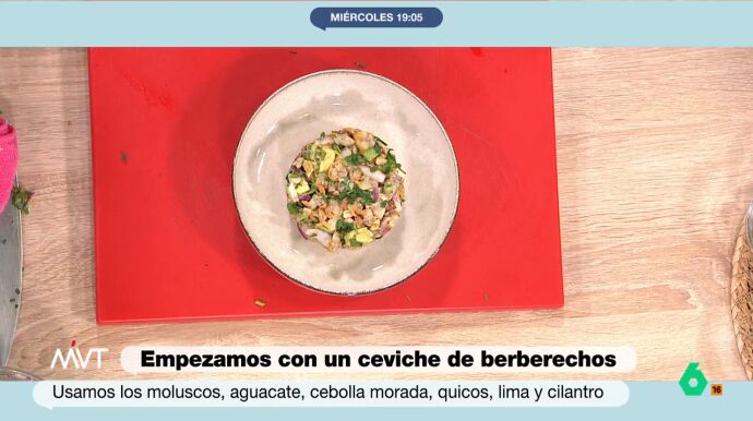 Entre el resto de ingredientes, encontramos en el vídeo sobre estas líneas cebolla morada, quicos, aguacate, que riega con lima y un poco del líquido de los berberechos. De sustituirlo por pescado crudo, Ojeda recuerda que debe ser "obligatoriamente congelado".