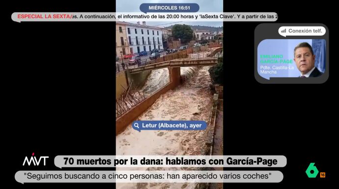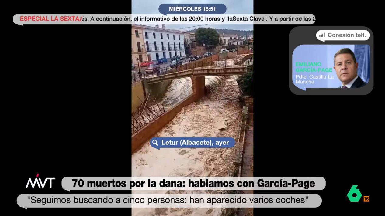 "Seguimos esperando a cinco personas que están en el cauce, que son cinco kilómetros hasta su desembocadura en el Segura, es donde ha aparecido el coche de una pareja", ha explicado el presidente manchego en Más Vale Tarde.