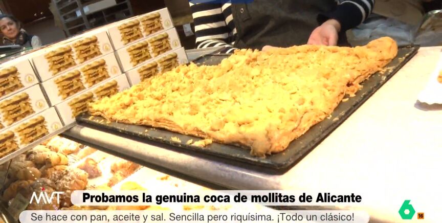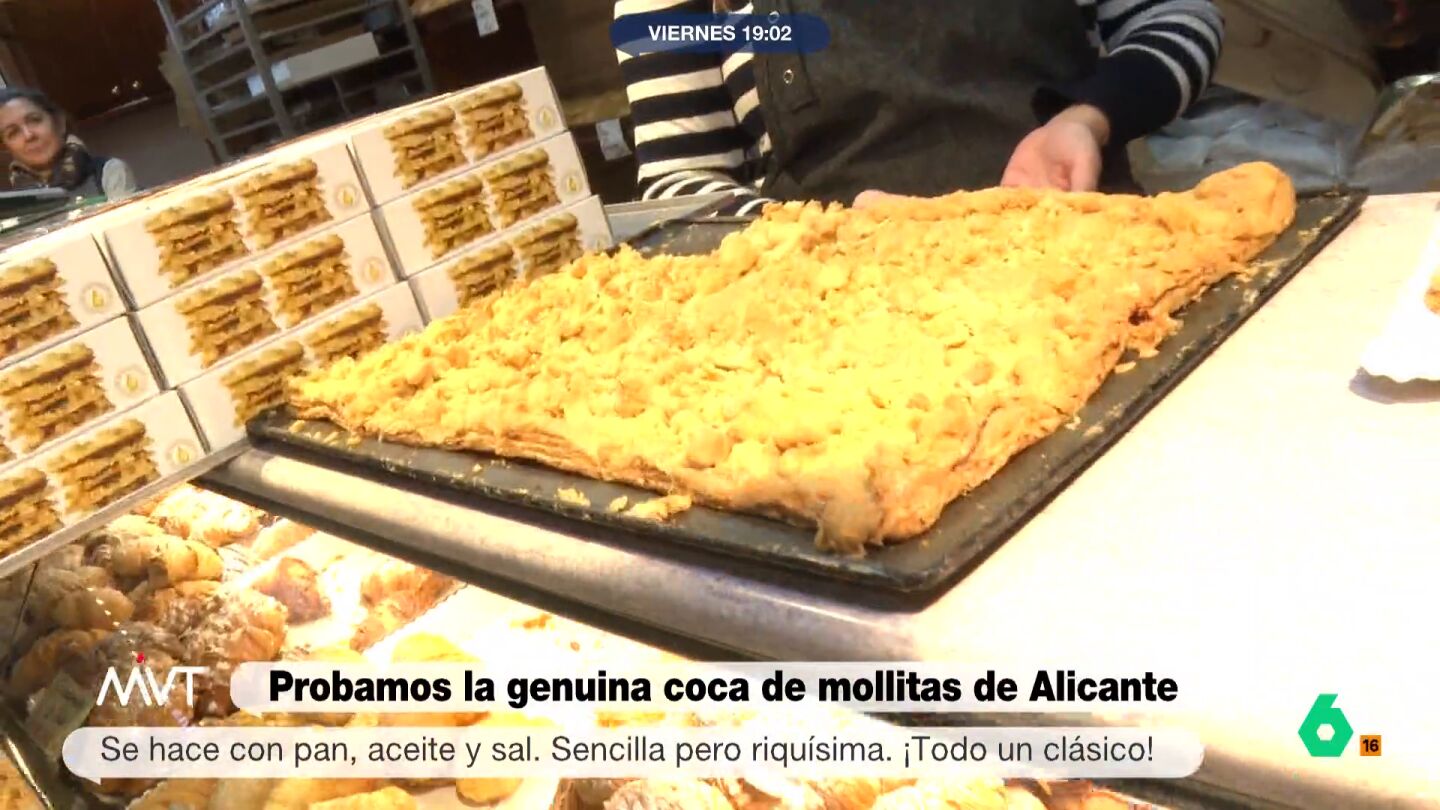 Después, Calero acude al puesto de Mari Carmen Fenoll para probar una de las mayores joyas gastronómicas de Alicante: la coca de mollitas. La base, como explica Mari Carmen, antes se hacía con pan pero ahora se hace con hojaldre y desvela que el truco para su buen sabor es amasarlas bien tras la mezcla se harina, aceite y sal.