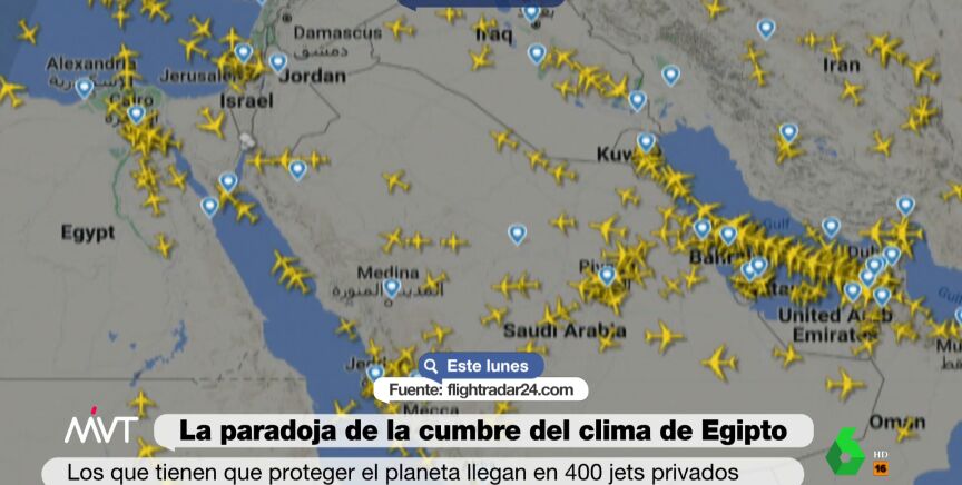 Joanna Ivars muestra una imagen esclarecedora, la del tráfico aéreo sobre Egipto, donde se celebra la cumbre del clima. Entre esos aviones hay 400 jets privados que han usado los líderes mundiales y que producen dos toneladas de CO2 en una hora.