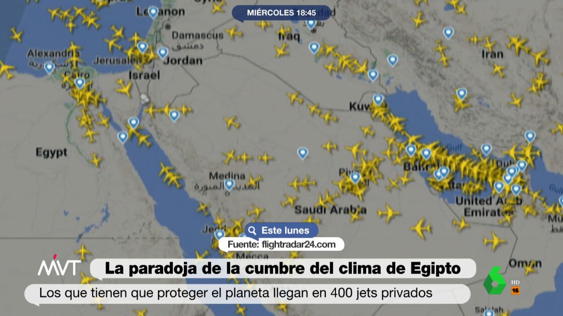 Joanna Ivars comparte con Cristina Pardo e Iñaki López una imagen que representa la paradoja de la Cumbre del Clima de Egipto. Desde una aplicación que muestra el tráfico aéreo sobre la zona en la que se celebra esta reunión de líderes mundiales para debatir sobre el cambio climático, se puede ver cómo hay un considerable movimiento de aviones.