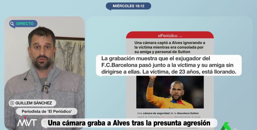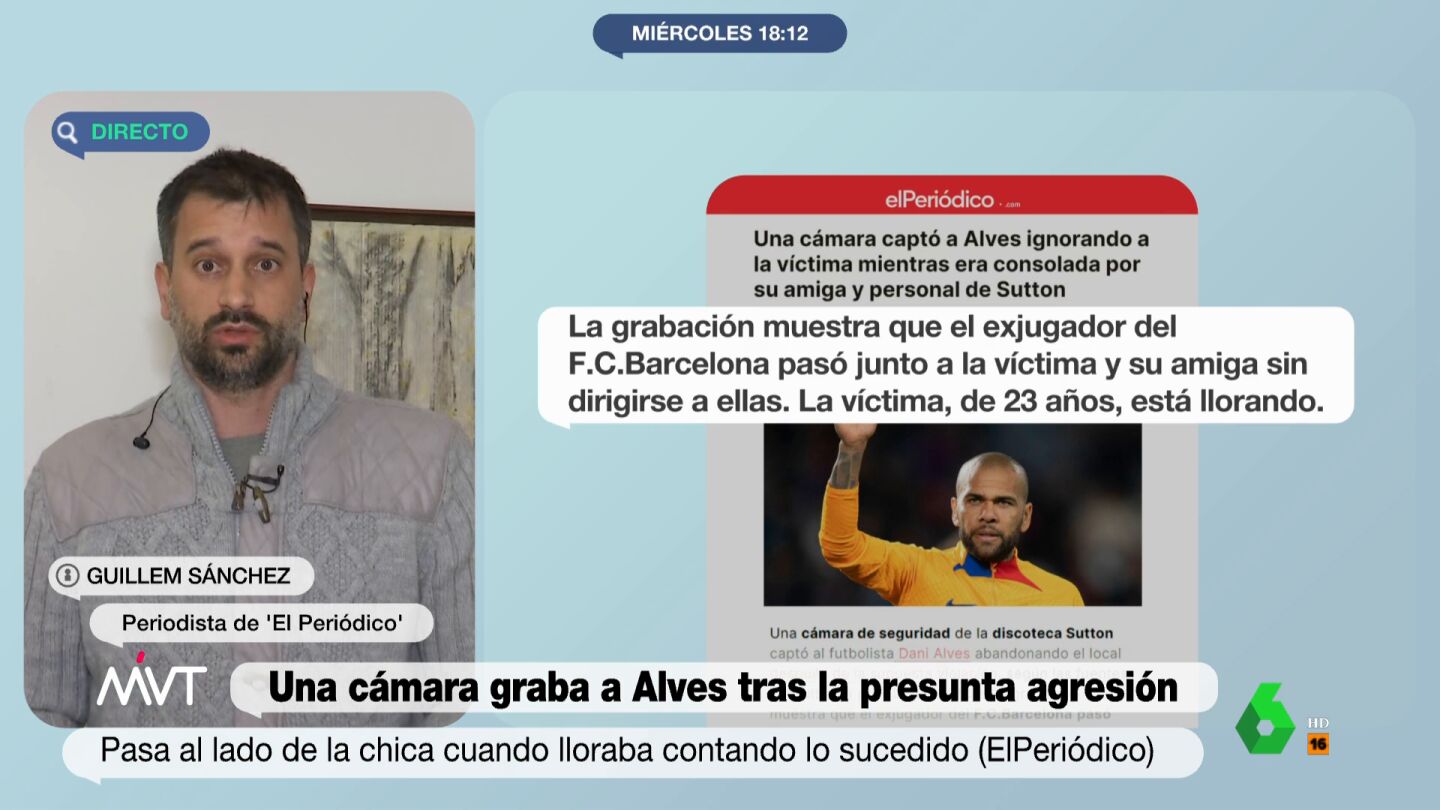 El periodista Guillem Sánchez ha explicado en Más Vale Tarde cuáles fueron los pasos del exfutbolista y de la joven que le ha denunciado por agresión sexual tras salir del baño de la discoteca Sutton: "Dani Alves no muestra ningún interés en por qué la joven está llorando".