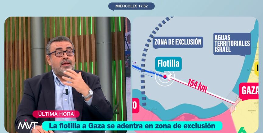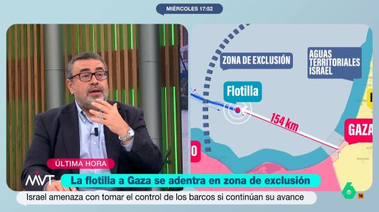 Pedro Rodríguez explica en este vídeo qué significa la zona de exclusión en las reglas marítimas y cómo Israel "implementa un control por tierra, mar y aire" de Gaza, lo que complica que la flotilla llegue a buen puerto.