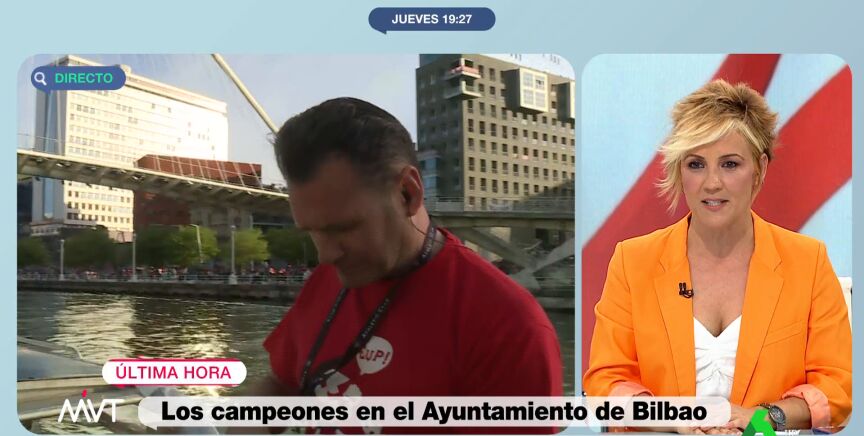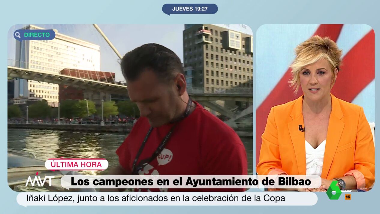 Iñaki López ha estado retransmitiendo toda la tarde el periplo de la gabarra del Athletic Club a lo largo de su rúa por la ría de Bilbao para celebrar el título de la Copa del Rey. En el vídeo sobre estas líneas, el presentador explica cómo serán los últimos pasos del festejo, donde los jugadores desembarcarán en el Ayuntamiento para luego ofrecer el título a la afición.