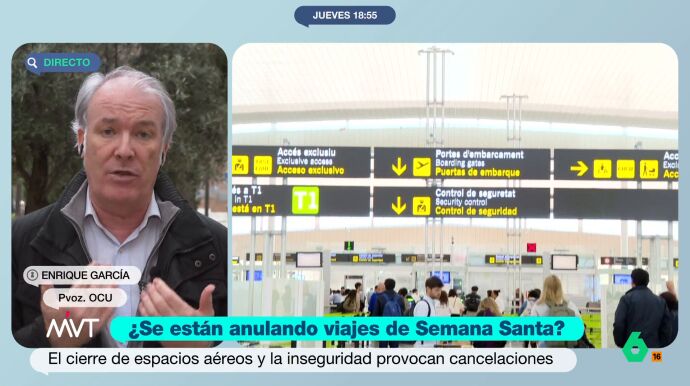 Debido a la escalada bélica en Oriente Medio, muchas personas se están planteando cancelar los viajes planeados para Semana Santa a lugares cercanos ante la incertidumbre sobre la duración de este. Para conocer qué opciones tienen los usuarios, Más Vale Tarde habla con Enrique García, portavoz de OCU.