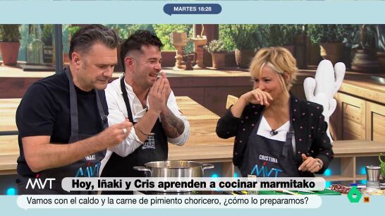La primera reacción de Cristina Pardo al marmitako que cocina con Iñaki López y Carlos Maldonado: "Está picante de cojones"