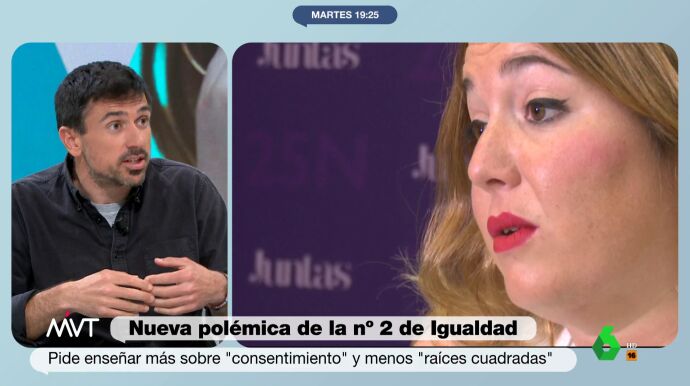 Tras las polémicas declaraciones de la número dos de Igualdad, Ramón Espinar defiende que no es necesario "pegarle una patada al sentido común" para defender la educación sexual: "Lo que dice es impecable hasta que llega a la cuñadez", lamenta.