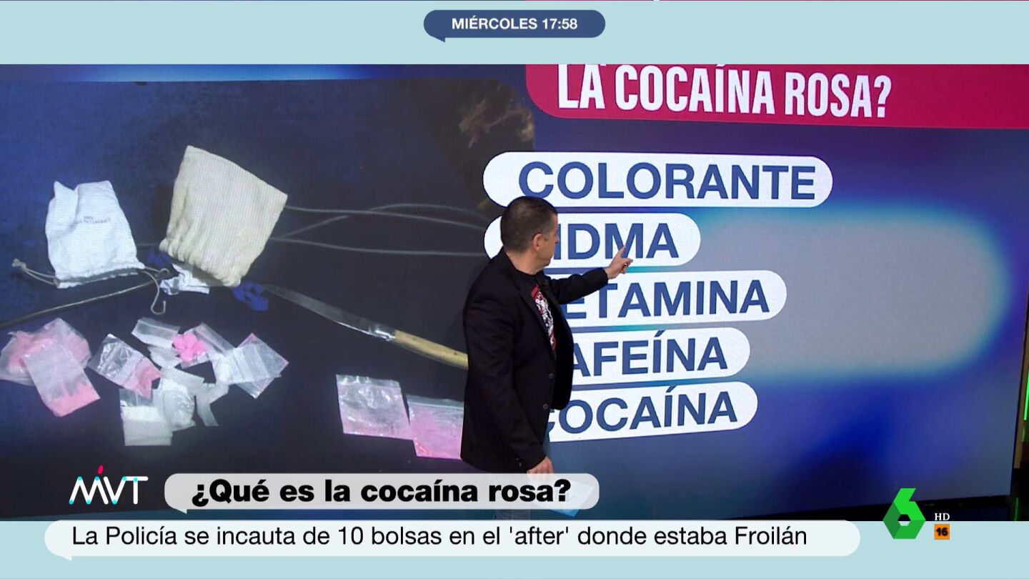 La cocaína rosa se ha puesto de moda. Sobre todo en lugares de música electrónica. Sin embargo, el jefe de Investigación de laSexta, Manuel Marlasca, señala que muchas veces no es ni cocaína. La policía ha intervenido una bolsita con una sustancia rosa, pendiente de analítica, del local que desalojaron este fin de semana y donde se encontraba Felipe Juan Froilán.