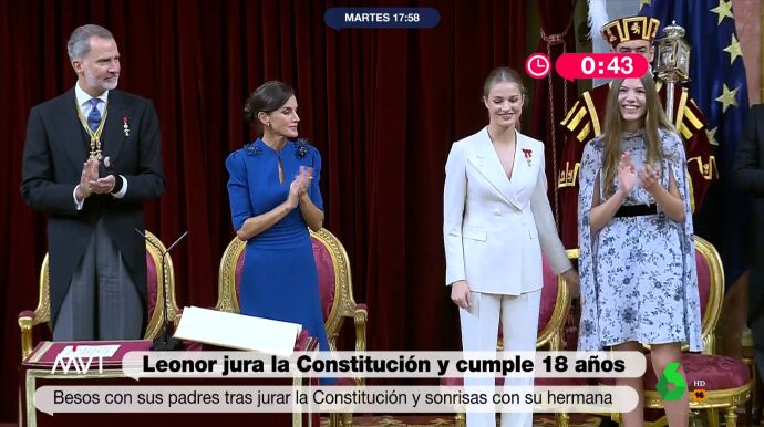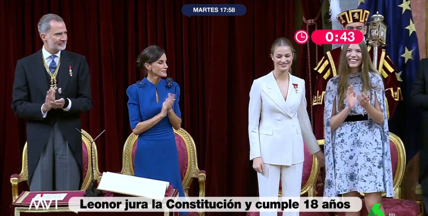 La reina Letizia ha aparecido bastante seria durante todos los actos con motivo de la jura de la Constitución de la princesa Leonor. Ha sido la primera en abandonar la tribuna del Congreso donde estaba la familia real y también la primera en salir del hemiciclo, además de la primera en abandonar la sala donde Felipe VI ha firmado el Libro de Honor de la Cámara Baja.