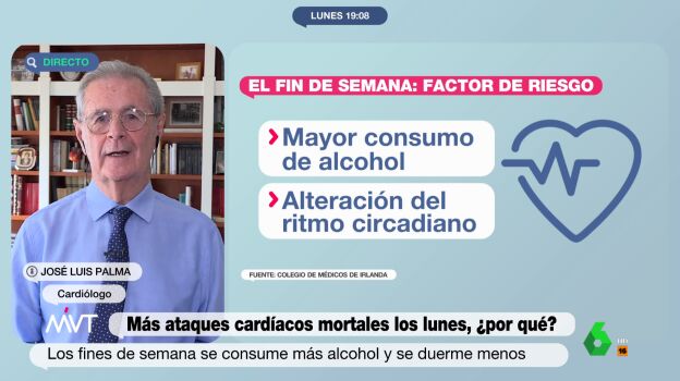José Luis Palma ha explicado que los lunes es más propenso que se produzcan ataques cardíacos debido a que durante el fin de semana solemos alterar los ritmos circadianos, reconociendo que existen muchos estudios que confirman esta teoría. "Lo importante es llevar una vida lo más sana posible", ha asegurado.