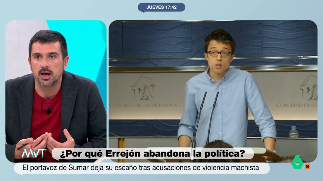 El portavoz de Sumar en el Congreso, Íñigo Errejón, ha anunciado su dimisión de este cargo, la renuncia a su escaño y su decisión de abandonar la política institucional, según ha avanzado en una carta difundida en X. Una decisión que se ha dado tras salir a la luz unas informaciones de 'Público' en el que le relacionan con casos de agresiones sexuales.Por ello, el analista político, Ramón Espinar, ha comentado en Más Vale Tarde aclarando que es un tema complejo y con muchas "aristas".