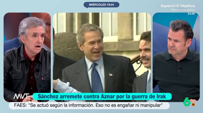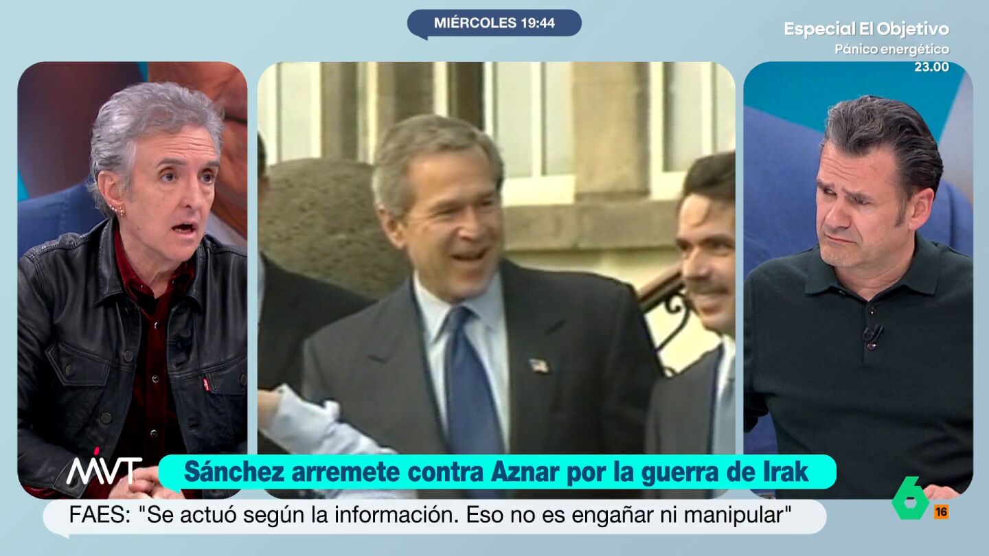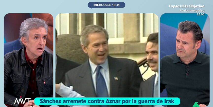 Iñaki López reflexiona sobre Aznar en el plató de MVT: "Aznar, que arrastra muchas trolas a sus espaldas como el 11M y ETA, es cierto que sabía lo mismo que Bush y Blair en el momento de la guerra, pero no es menos cierto que los otros dos han pedido disculpas por el lío en el que nos metieron a todos con información falsa y él no lo ha hecho nunca". "Es decir, una vez que sabes que te has equivoca puedes pedir disculpas como lo han hecho los otros dos y que él no ha hecho nunca", asegura el presentador de MVT.