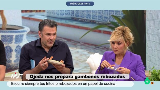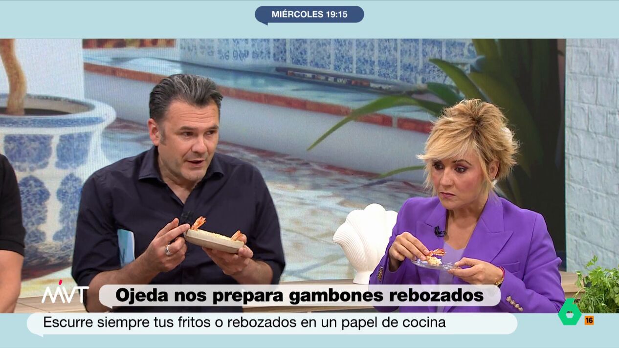 Pablo Ojeda habla hoy de rebozados y cocina unos gambones con panko, un pan japonés, que salen de la sartén en pocos minutos. La reacción de Cristina Pardo e Iñaki López a la celeridad, y el sabor, del plato, en este vídeo de Más Vale Tarde.